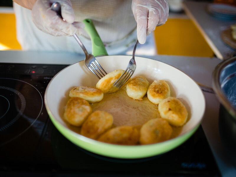 Składniki: Ciasto: ziemniaki (0,9kg), mąka ziemniaczana (0,25kg), dwa jajka, sól do smaku.Farsz: mięso gotowane (0,15kg), dwa jajka ugotowane na twardo, cebula (0,8kg), olej do …