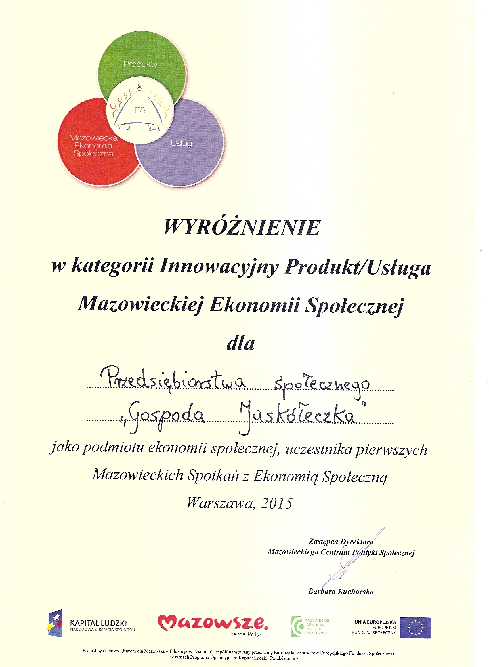 W dniu 16 czerwca 2015 r. uczestniczyliśmy w Targach organizowanych przez Mazowieckie Centrum Polityki Społecznej połączonych z Konferencją „Mazowieckie Spotkania z Ekonomią Społeczną” w Warszawie . Prezentowaliśmy swoje wyroby. Podniebienie zaproszonych gości podbiły nasze produkty, w szczególności gorące pierogi podane w niekonwencjonalny sposób. Jako jedyni uzyskaliśmy wyróżnienie w kategorii „Innowacyjny Produkt/Usługa”.